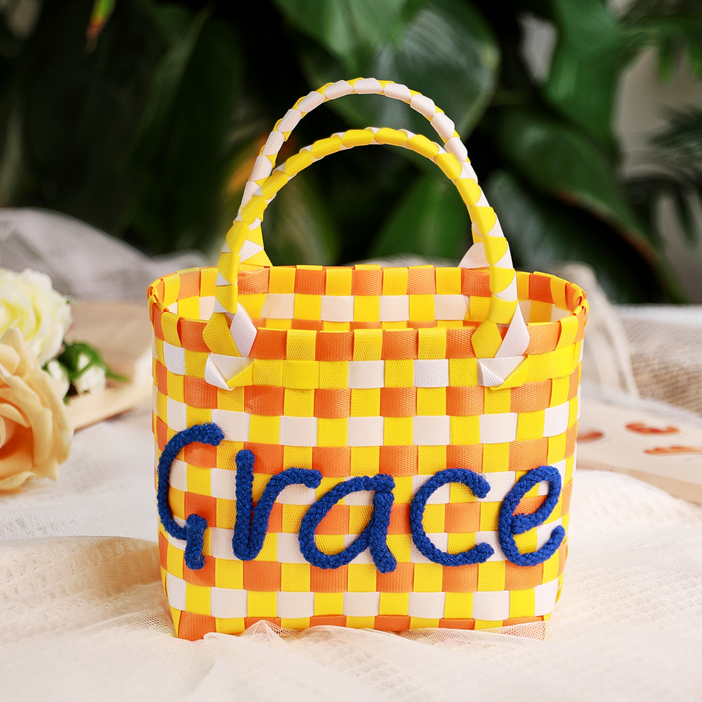 Custom Name Handbag Plastic Woven Basket Summer Fresh Color Matching Gift Basket Vegetable Basket Seaside Beach Bag
