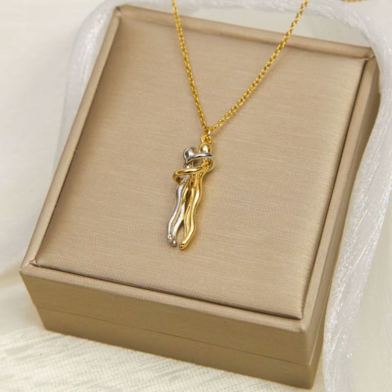The unique pendant features a striking two-tone design, with one figure in a warm gold tone and the other in a lustrous silver tone. This elegant contrast makes the embrace truly stand out, representing the harmonious coming together of two individuals.