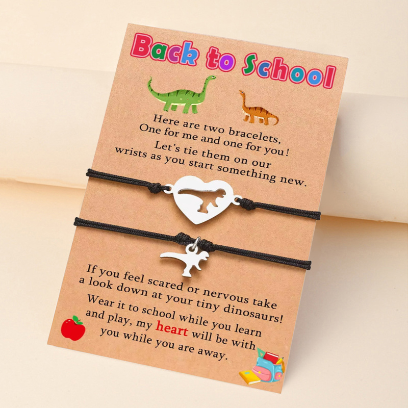 Help ease the first-day jitters with this adorable "Back to School" dinosaur bracelet set. It's the perfect way for a parent and child to stay connected, no matter how far apart they are. This matching set is a tangible reminder of your love and support, providing comfort and confidence as they begin their new adventure.