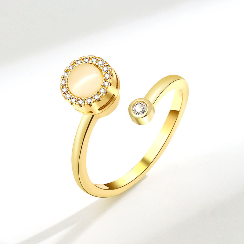 Crafted from premium 925 sterling silver and luxuriously plated with 14K gold, this ring offers a beautiful, long-lasting finish. The intricate design features a central, round white opal stone surrounded by a halo of sparkling cubic zirconia. The entire bezel-set centerpiece is a spinning mechanism, allowing you to gently and discreetly spin away your worries.
